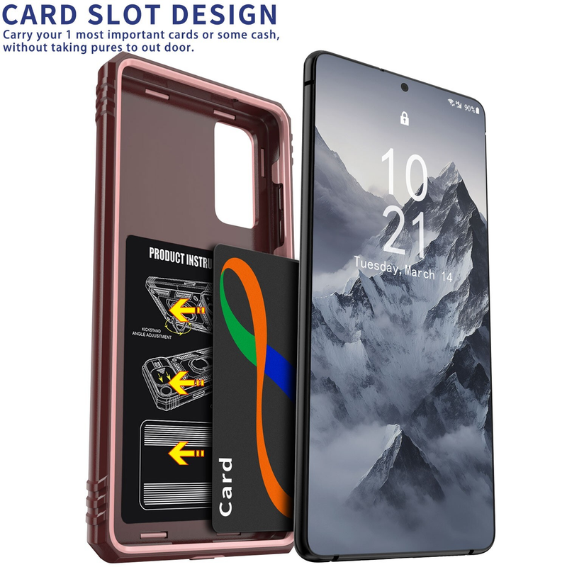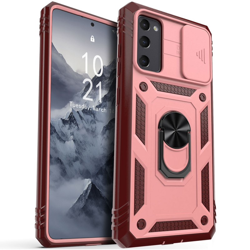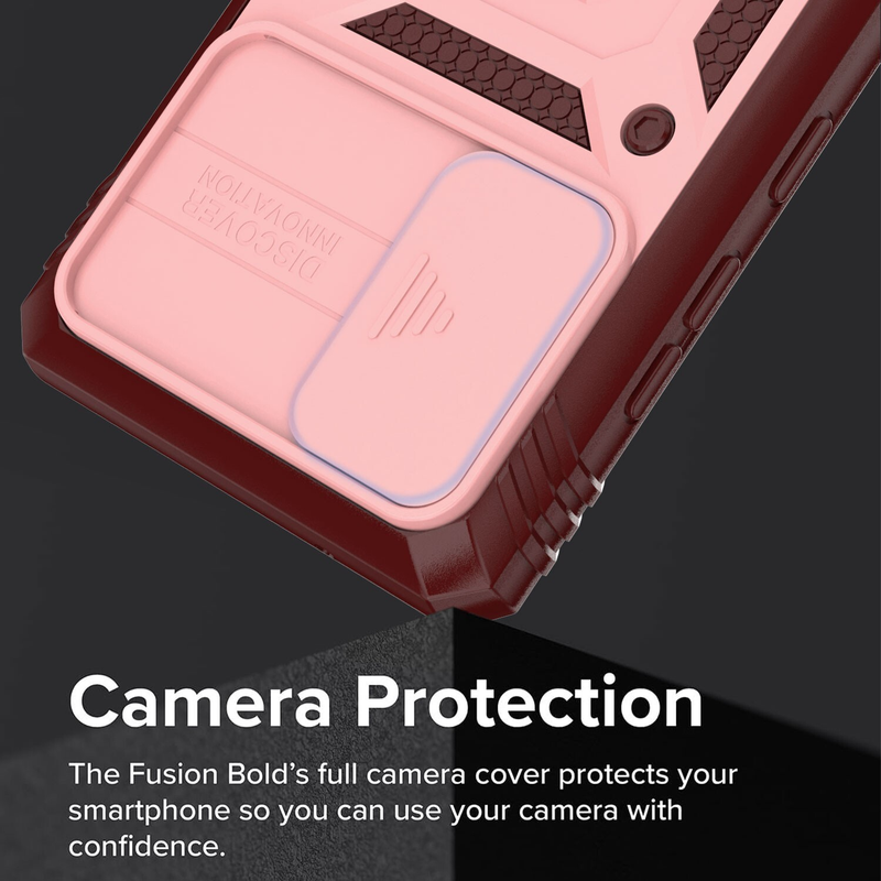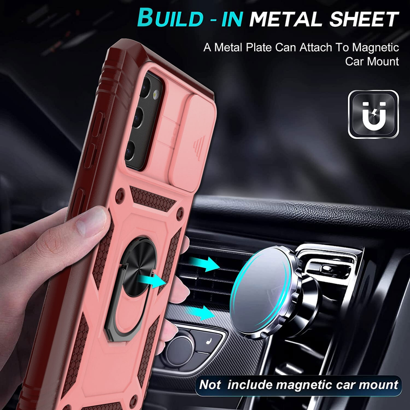 Features of this case include a sliding protective camera cover to prevent scratches and keep dust off the lens, a 360˚ rotating and 100˚ flipping ring kickstand for hands-free use, and a magnetic sheet for convenient in-car use.
