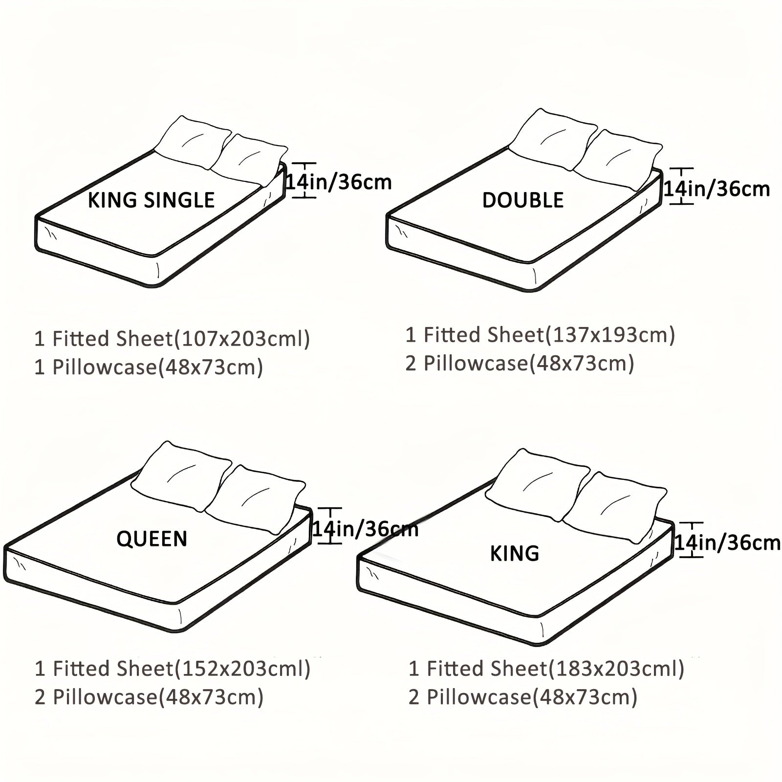 Queen Size Sheet Set Includes:(3 Piece) 1 x Fitted Sheet: 152cm x 203cm + 36cm Wall 2 x Standard Pillowcase: 48cm x 73cm