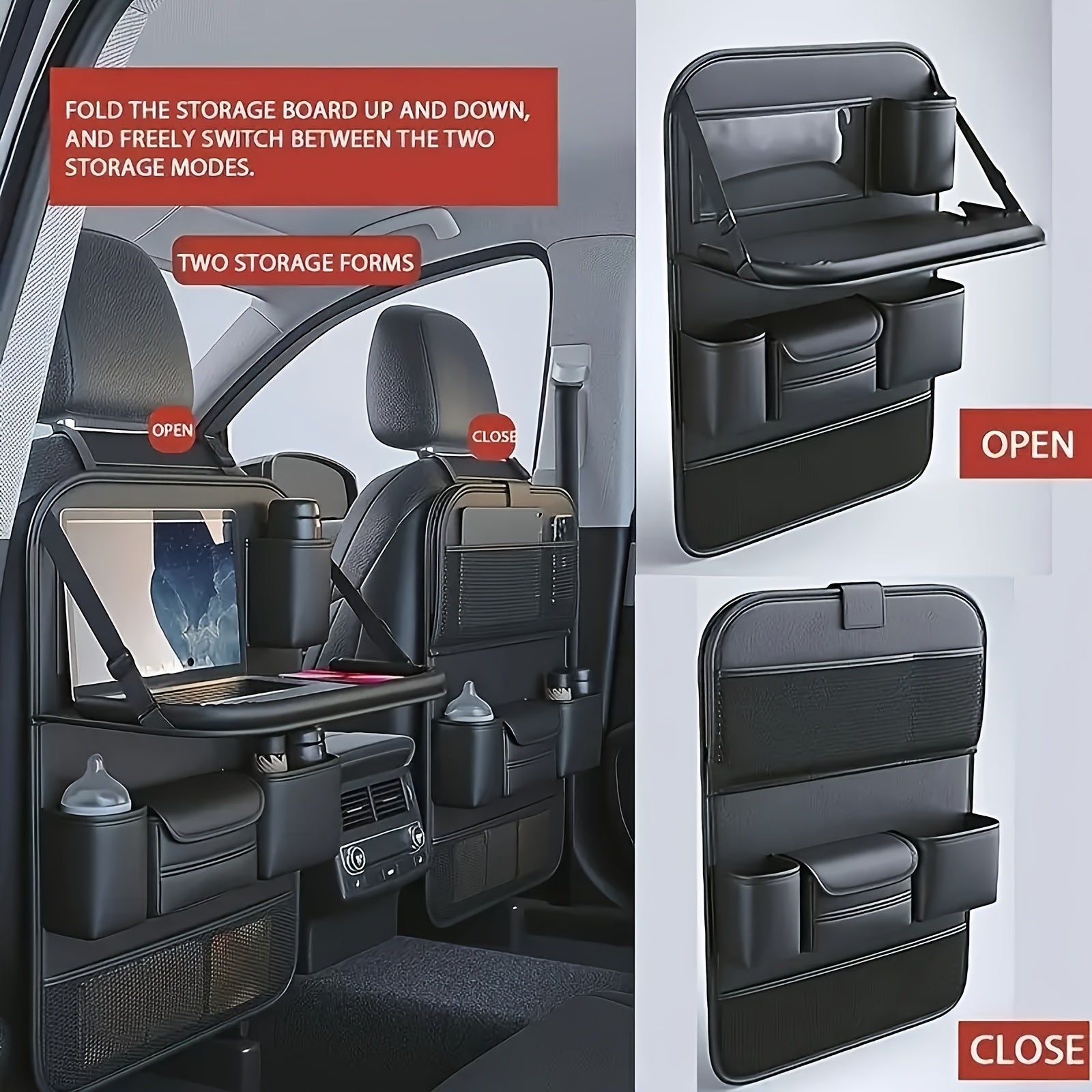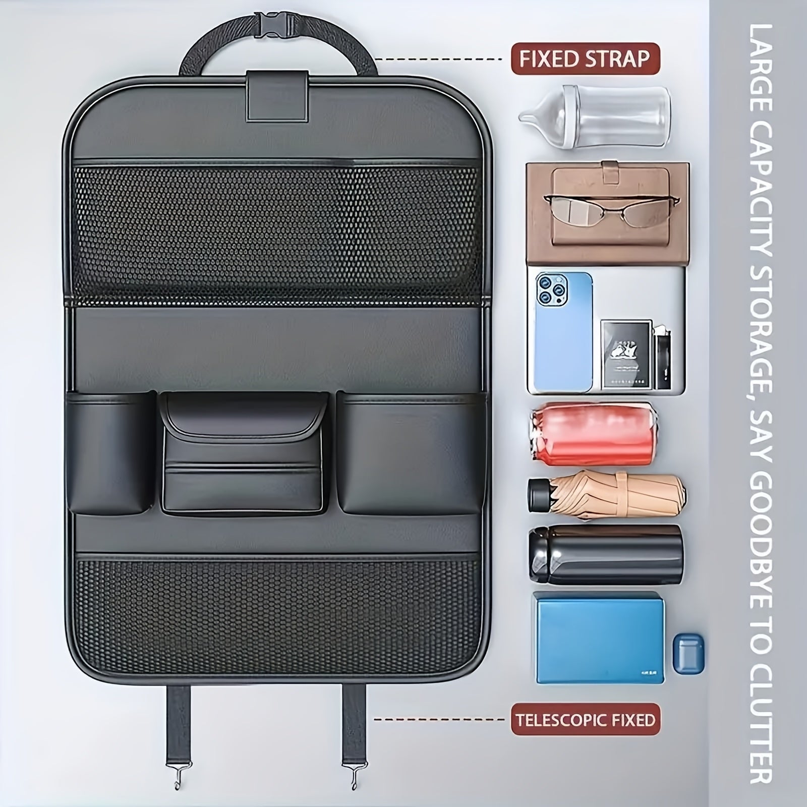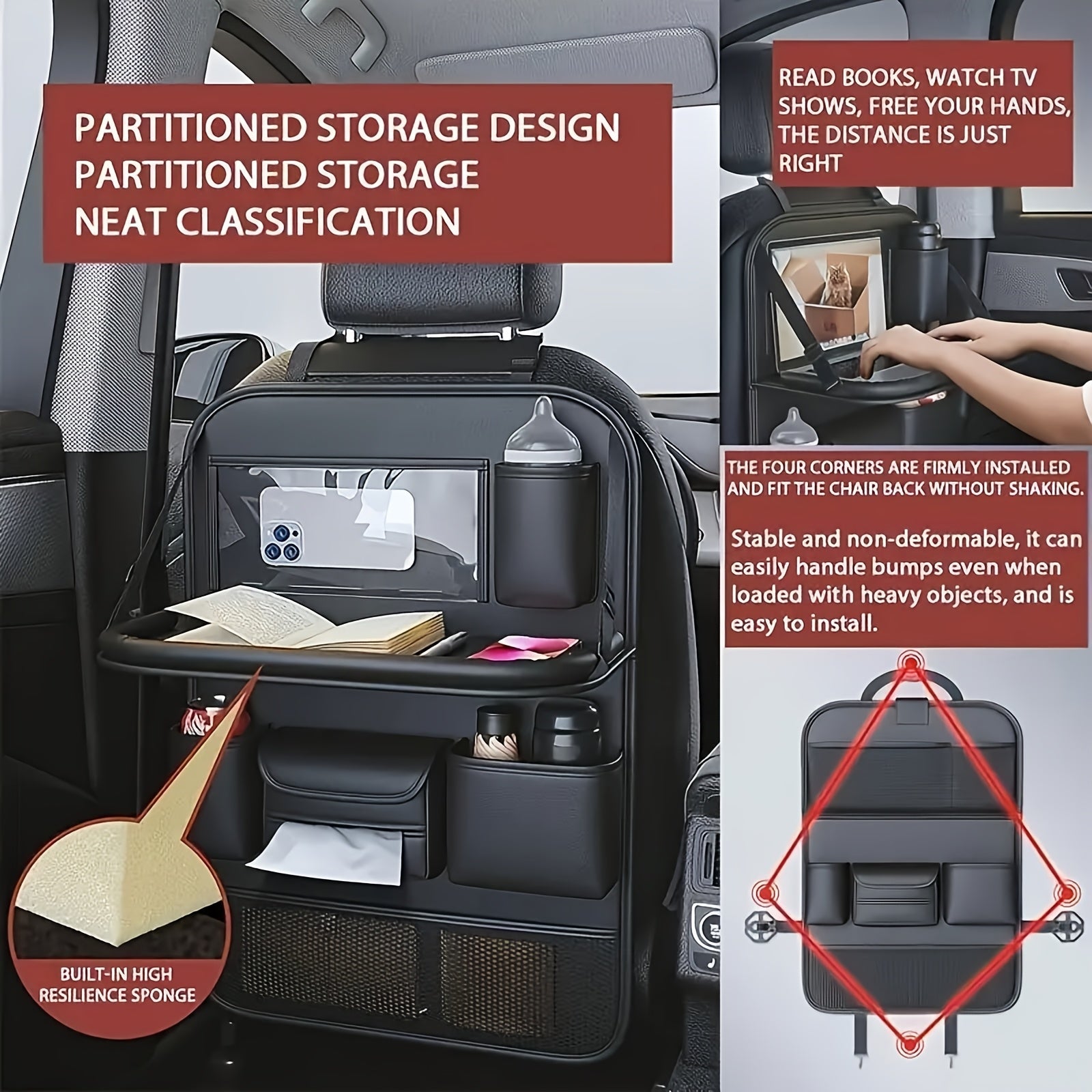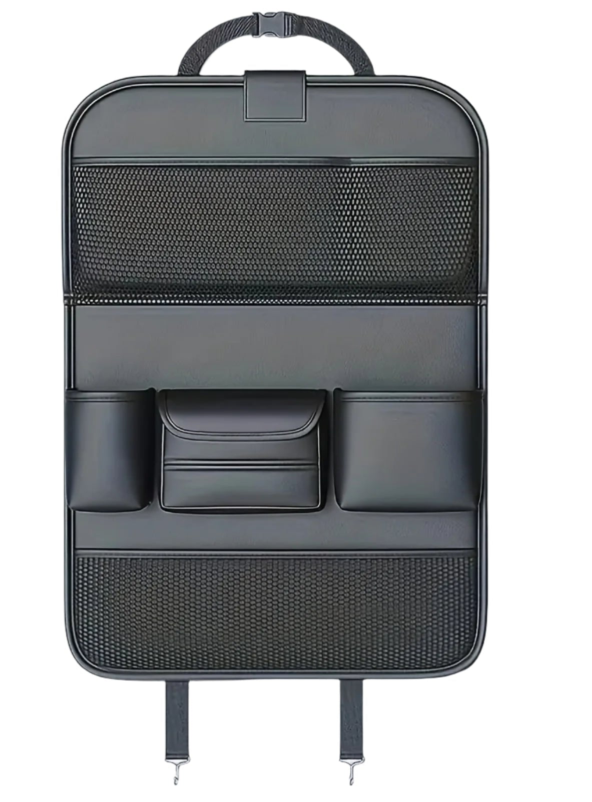 This premium car seat back organizer offers versatile storage with multiple compartments designed for toys, books, tablets, bottles, umbrellas, and magazines, ensuring a tidy and organized vehicle interior.