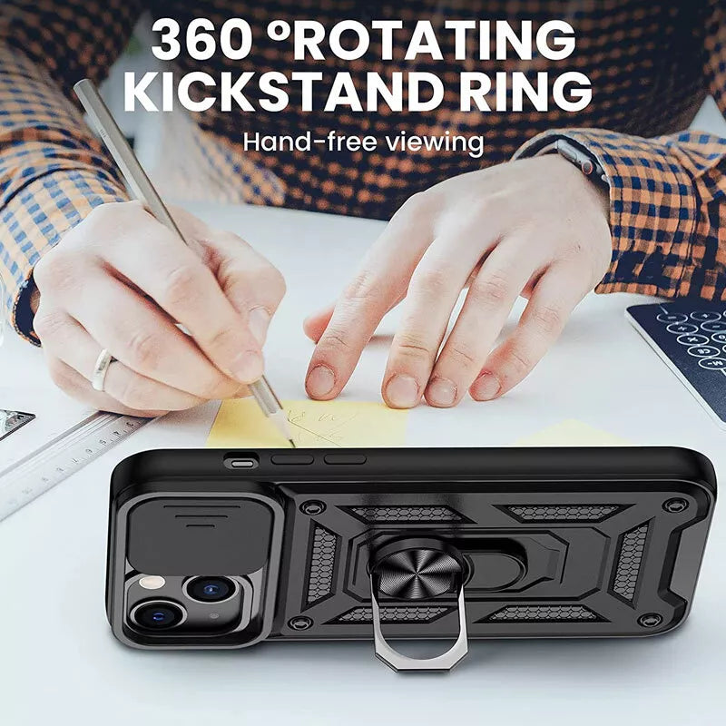 Features of this case include a sliding protective camera cover to prevent scratches and keep dust off the lens, a 360 rotating and 100 flipping ring kickstand for hands-free use, and a magnetic sheet for convenient in-car use.