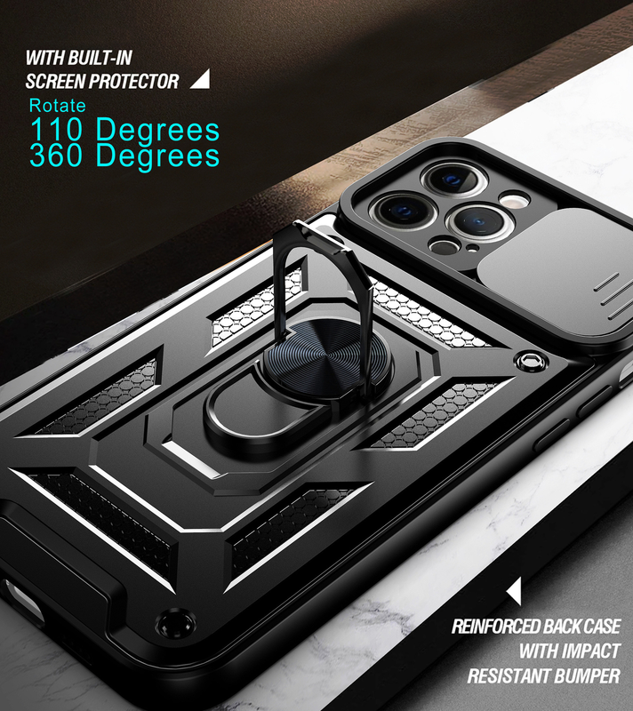 Features of this case include a sliding protective camera cover to prevent scratches and keep dust off the lens, a 360 rotating and 100 flipping ring kickstand for hands-free use, and a magnetic sheet for convenient in-car use.