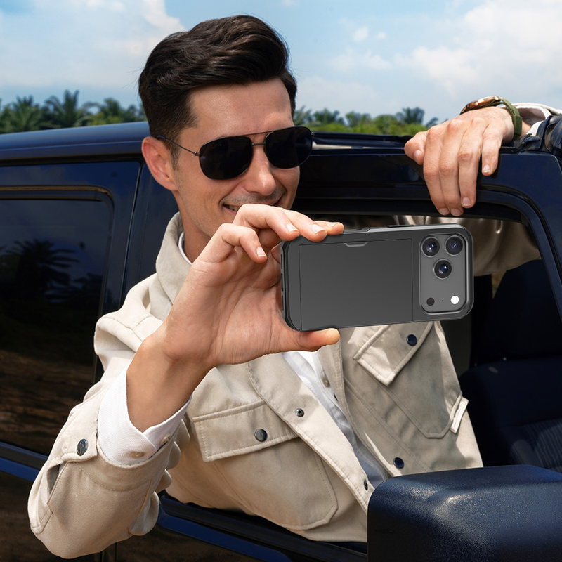 This slide wallet cover for the Apple iPhone 17 Pro offers expert-level protection with a dual-layer hybrid design—combining a tough anti-scratch polycarbonate exterior and a shock-absorbing TPU interior to guard against drops and daily wear.