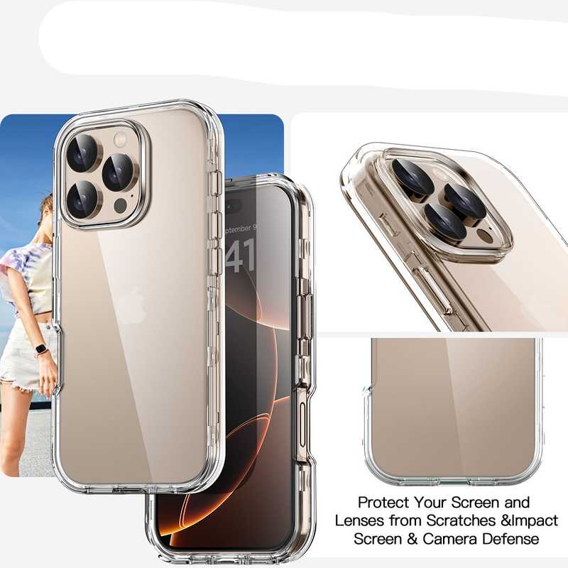 This Shockproof Clear Cover for iPhone 16 Pro Max features a robust 3-layer design combining a hard PC back cover, inner silicone layer, and rugged PC bumper for superior shock and drop protection. Its crystal-clear polycarbonate and transparent TPU materials resist yellowing thanks to an embedded nano antioxidant layer, maintaining a pristine look over time.