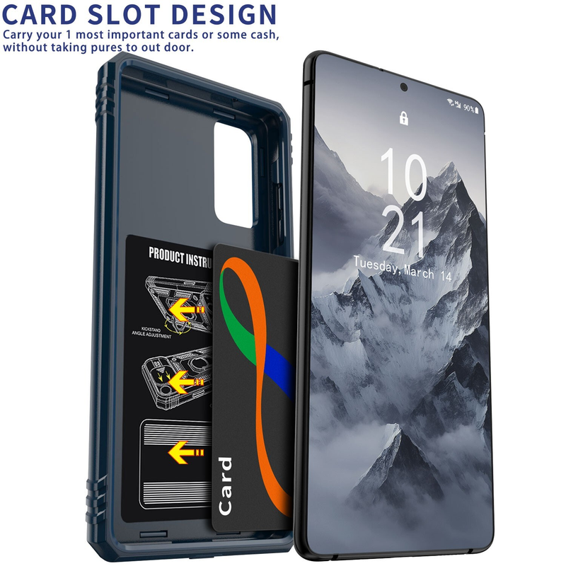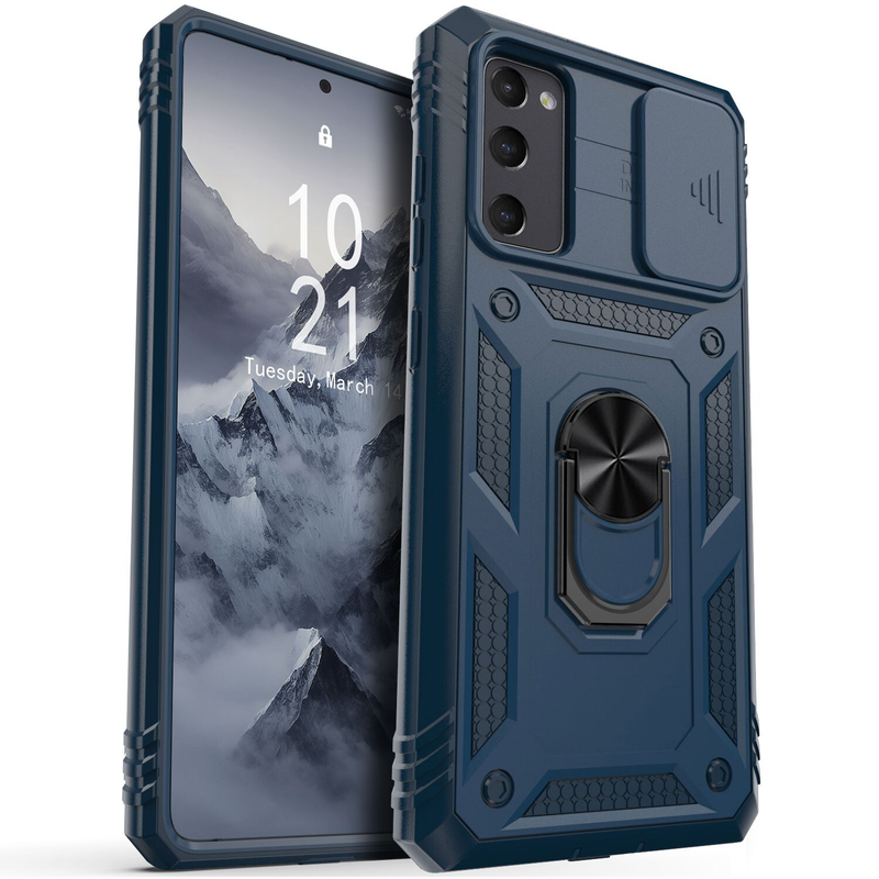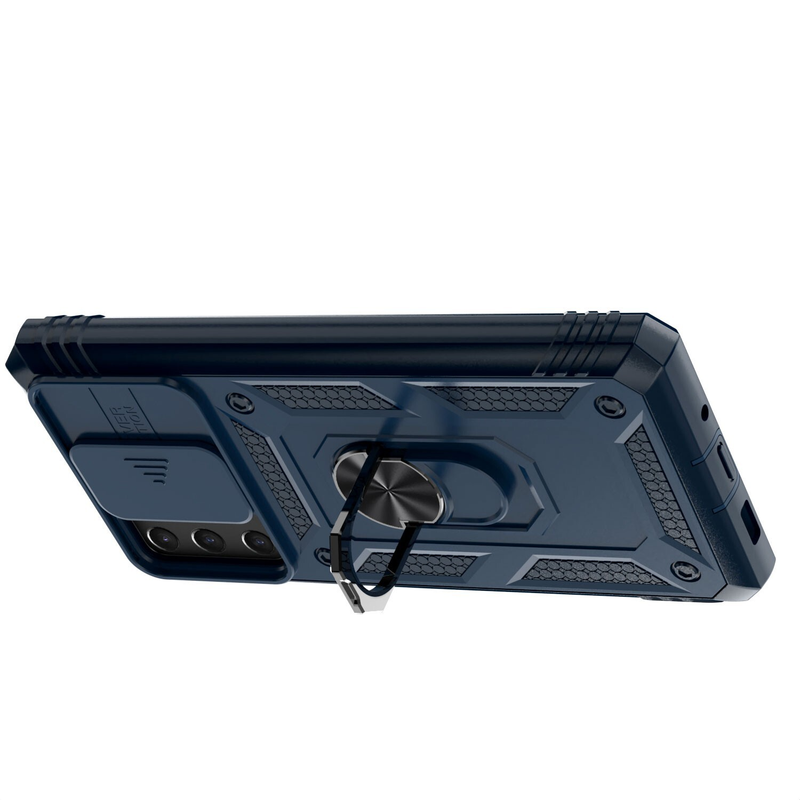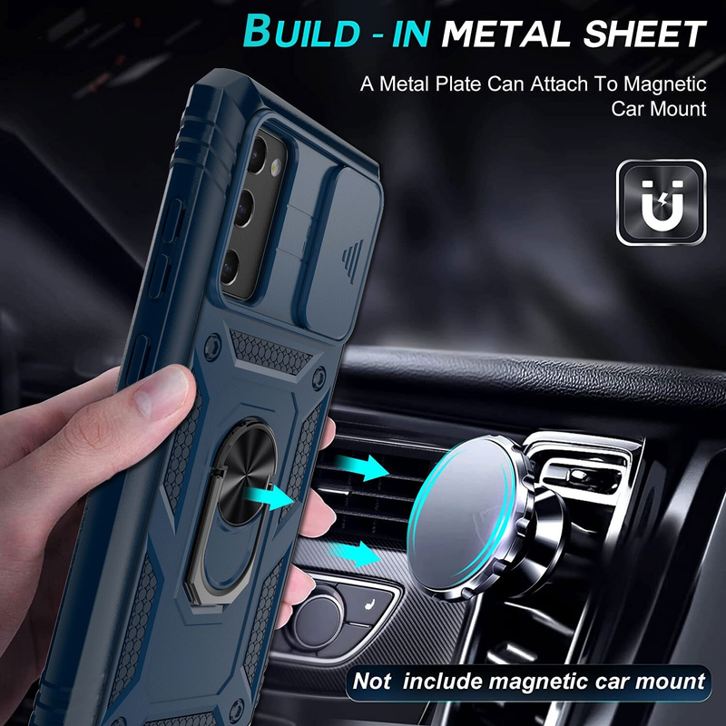 Features of this case include a sliding protective camera cover to prevent scratches and keep dust off the lens, a 360˚ rotating and 100˚ flipping ring kickstand for hands-free use, and a magnetic sheet for convenient in-car use.