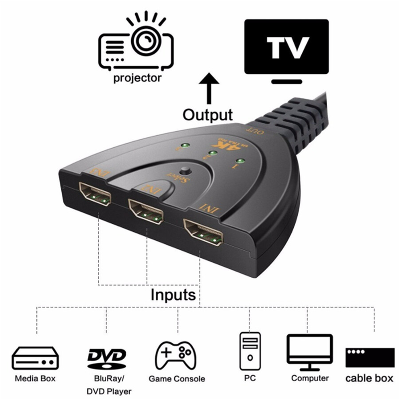 - HDMI Switch 4K, 3 Port HDMI Switch Splitter 4Kx2K with Pigtail HDMI Cable, Gold Plated Connector, 4K Ultra HD 3D support, 3 Input 1 Output HDMI Switcher for HDTV, PS3, Xbox One etc.